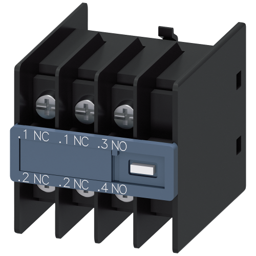 Auxiliary switch on the front, 1 NO + 2 NC Current path 1 NC, 1 NC, 1 NO for 3RH and 3RT Ring cable