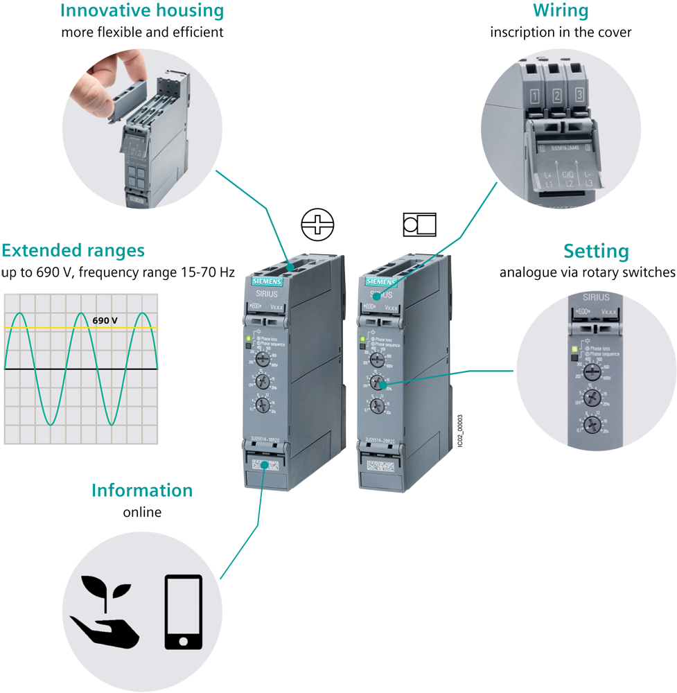 • Monitors phase failure, phase sequence, asymmetry, and under-voltage