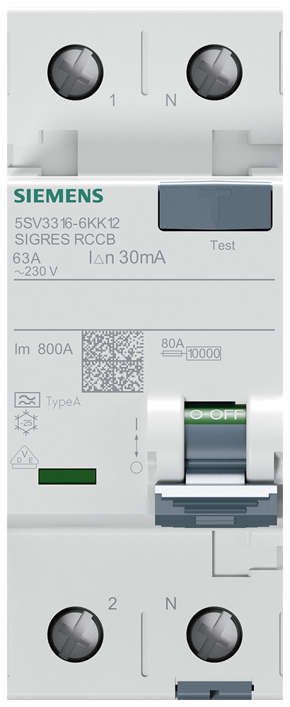RCCB, 2-pole, type A, In: 63 A, 30 mA, Un AC: 230 V, SIGRES
