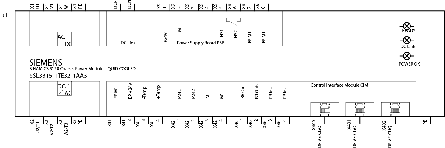 SINAMICS S120 converter power module 380 - 480 V 3AC, 50/60 Hz output: 210 A (110 kW) type of construction: built-in liquid cooling incl. DRIVE-CLiQ cable and mounting plate for CU310 support of the