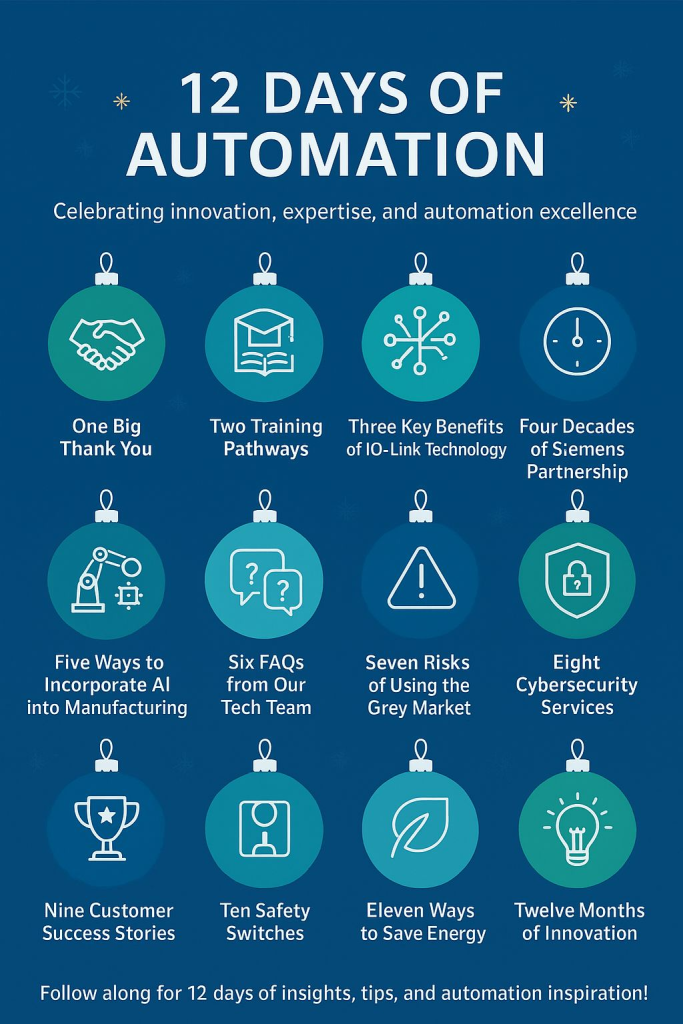 Get ready to celebrate innovation with our 12 Days of Automation! Along the way, discover training opportunities, key benefits of IO-Link technology, ways to integrate AI, and much more. Follow along as we showcase decades of expertise, practical solutions, and inspiring success stories—all designed to help you drive smarter, safer, and more efficient manufacturing.