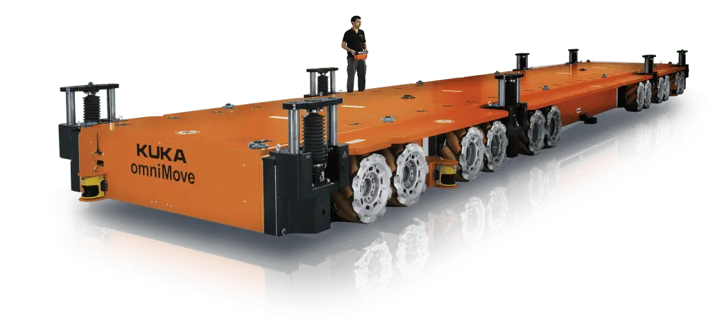 Specially developed wheels allow the mobile heavy-duty platform to move in any direction – even from a standing start. The sophisticated navigation system KUKA Navigation Solution ensures autonomous maneuvering without risk of collision and without requiring artificial floor markings. The KUKA omniMove can be freely scaled in size, width and length within a modular system – just the way you need it.