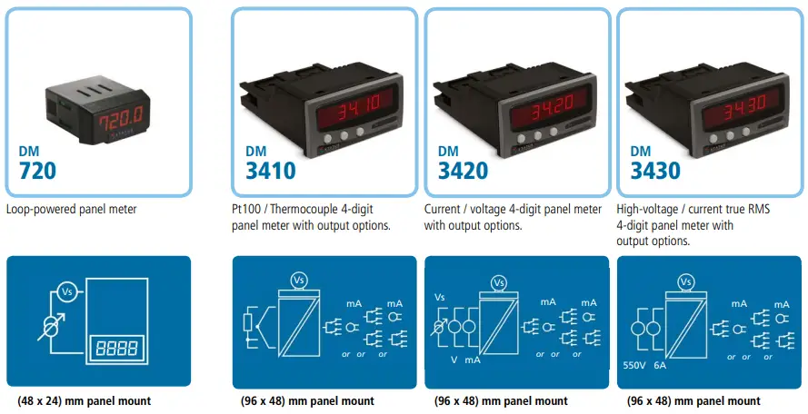 - DM720 – A compact panel mounted loop powered indicator that is designed to connect in series with a 4/20mA current loop and display the value in engineering units. Housed in a 48x24mm DIN standard panel mount case and provides 10mm high LED digits. The engineering range is programmed by using easily accessible push buttons. The design of the product means no external power supply is needed and it requires less than 5V from the current loop.