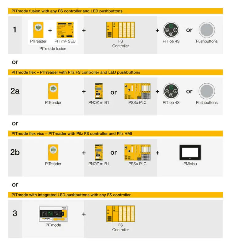 Pilz offers you safety and security functions in one system, with the operating mode selection and access permission system PITmode. The devices enable functionally safe operating mode selection and the control of access permissions on plant and machinery. Incorrect operation and tampering are thereby prevented and human and machine are protected. In order to find the perfect solution for individual requirements, the offer includes various hardware and software components for your one-stop safety and security solution.