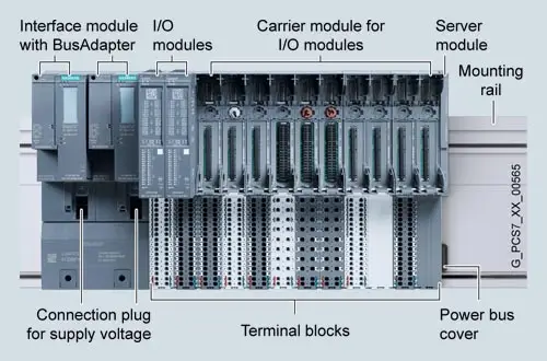 The slots for the I/O modules are created by connecting carrier modules and terminal blocks. The carrier modules provide the electrical and mechanical connections for the individual modules; the terminal blocks contain the process terminals for connecting sensors, actuators and other devices.